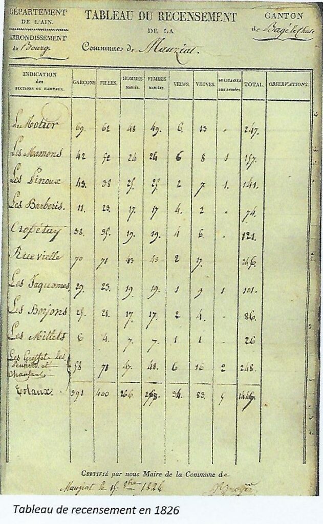 Le village en 1836 : Couvrant 1262 hectares à 8 km au Nord-Ouest de Bâgé-le-Châtel, la Commune mesure 3,6 km du Nord au Sud et 4 km d’Est en Ouest.