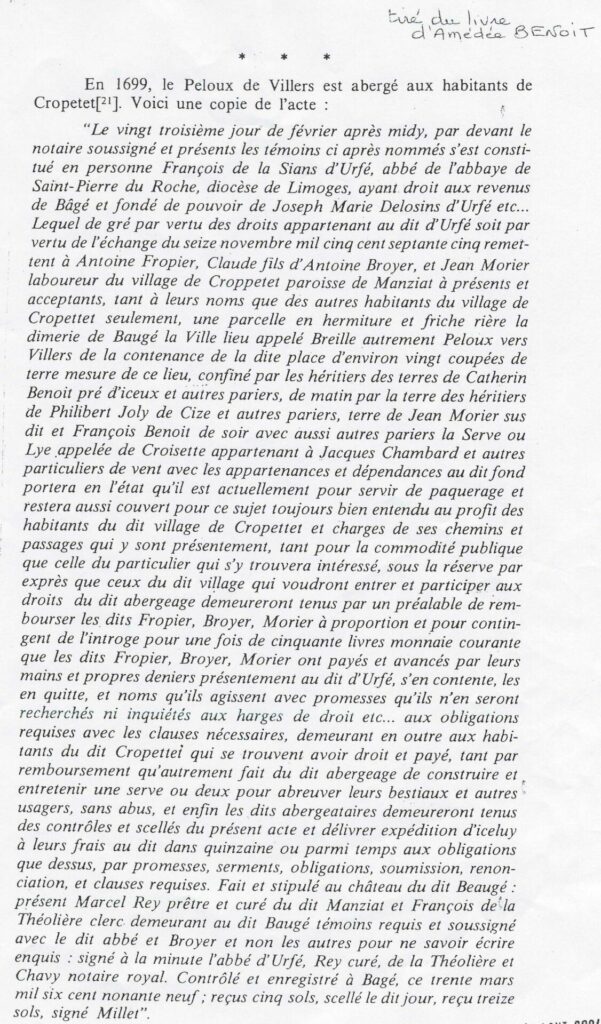En 1699 : Le peloux de Villiers est abergé aux habitants du « hameau de Cropetet » copie de l’acte du 23 février 1699 de Maitre Jean-Joseph Chavy notaire royal de Bâgé , une parcelle de terrain de Vingt coupées sur la commune de Bâgé-la-Ville (ancienne unité de surface).