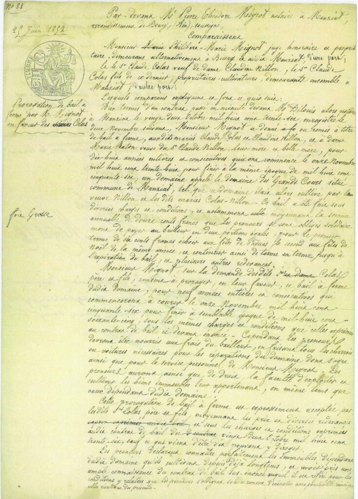 En 1792 : Claude Nillion fils de Pierre de Manziat épouse Marie Ratton sur l’acte de mariage en 1821 de sa fille Marie Anne Nillon née le 2.01.1796 épouse de Jean François Broyer. Claude Nillion propriétaire au Grands Cours. Une autre fille Marie Claudine Nillon née en 1801 , mariage le 8.02.1823 a Claude Colas né le 7.07.1785 décès le 13.12.1871 au Domaine des Grands Cours , Bail de Maitre Mignot du 25.06.1852.