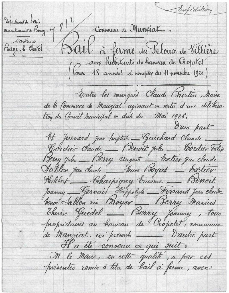 En 1852: le conseil municipal de Manziat refuse aux habitants de Cropetet le droit de défricher le Peloux de Villiers , les habitants de Cropetet engagent une action en justice pour jouir de ce terrain en pleine propriété, mais en 1853 , le Préfet autorise la mise en culture sous réserve que cette pâture soit divisée en lots, la commune restant propriétaire du fond.