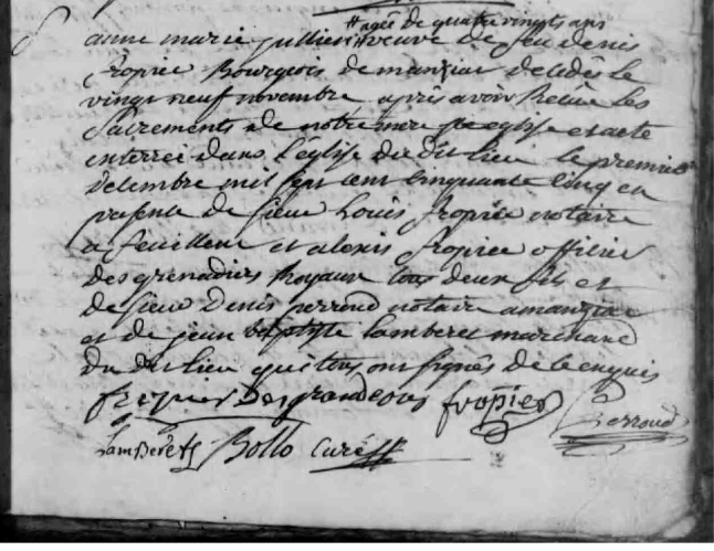 Vers 1755 : Un Fropier membre d’une famille qui comprenait des notaires, des chirurgiens, des avocats, des officiers signe sur acte paroissiale de sépulture Fropier des Grands – Cours.